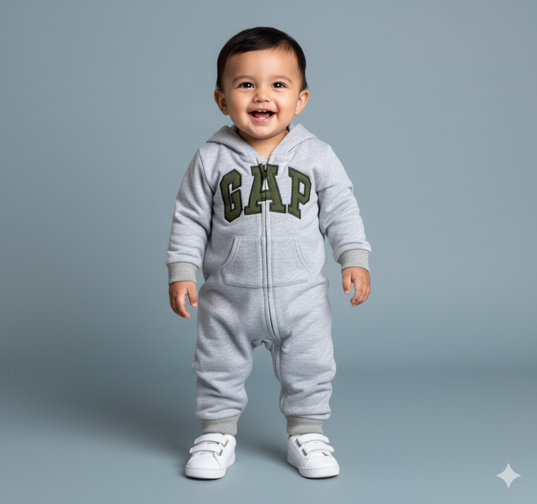 Cuddle-ready comfort meets sporty style! This adorable hooded romper features cute bear ears on the hood and bold "GAP" lettering in olive green, making it the perfect all-in-one outfit for your little one's adventures.