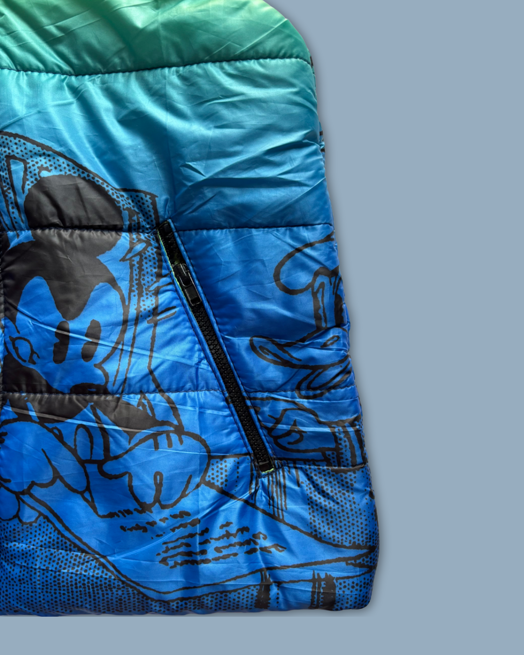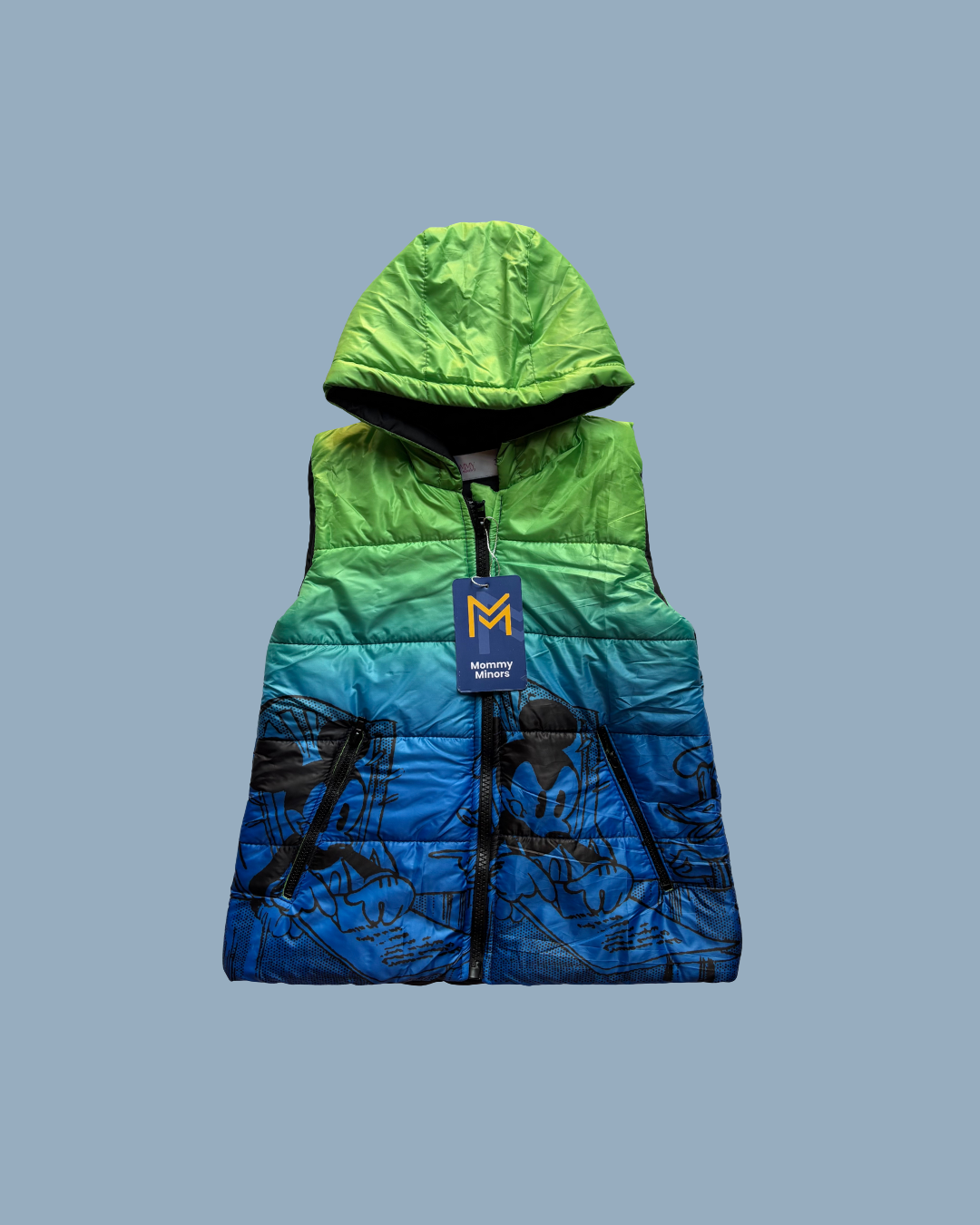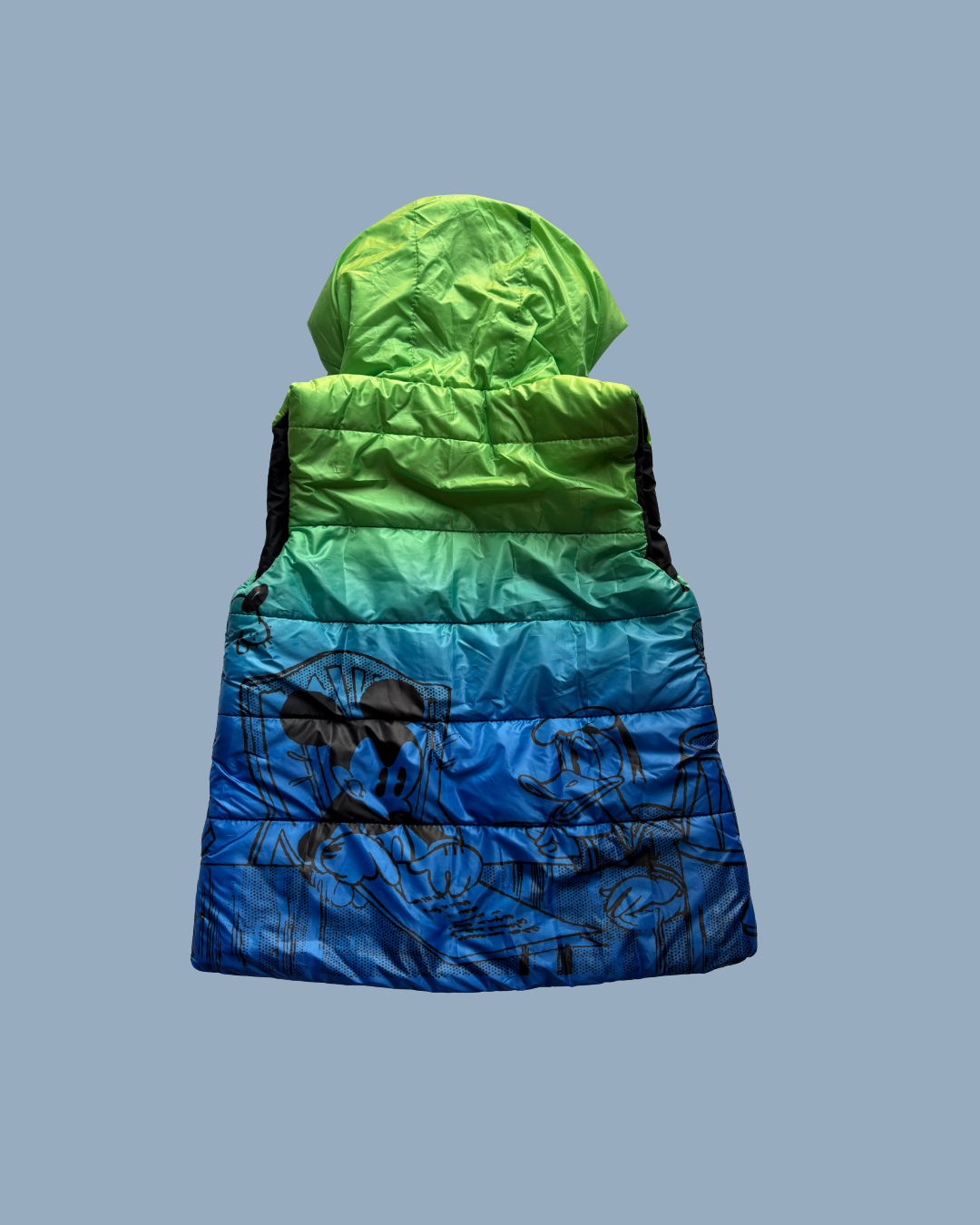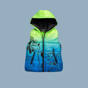 Add a pop of color and warmth to your little one's wardrobe with this eye-catching ombre puffer vest! Featuring a stunning green-to-blue gradient with playful cartoon graphics, this hooded vest is perfect for layering during transitional weather.