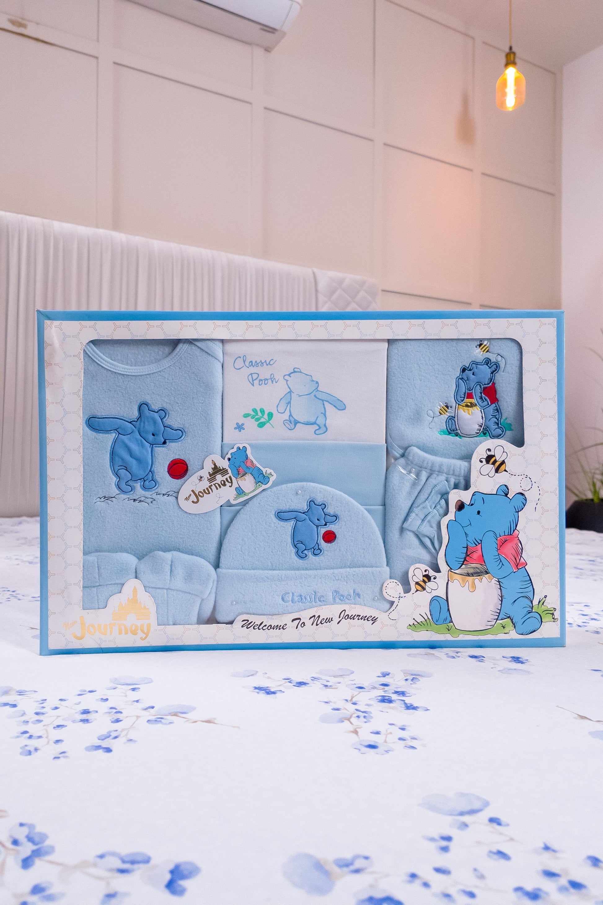 Made with 100% cotton fabric, ensuring maximum comfort and breathability for your baby's delicate skin. The set features a calming blue color scheme with charming decorative details in white and pink. Perfect for newborns and infants, this gift set provides everything needed for a baby's wardrobe essentials.