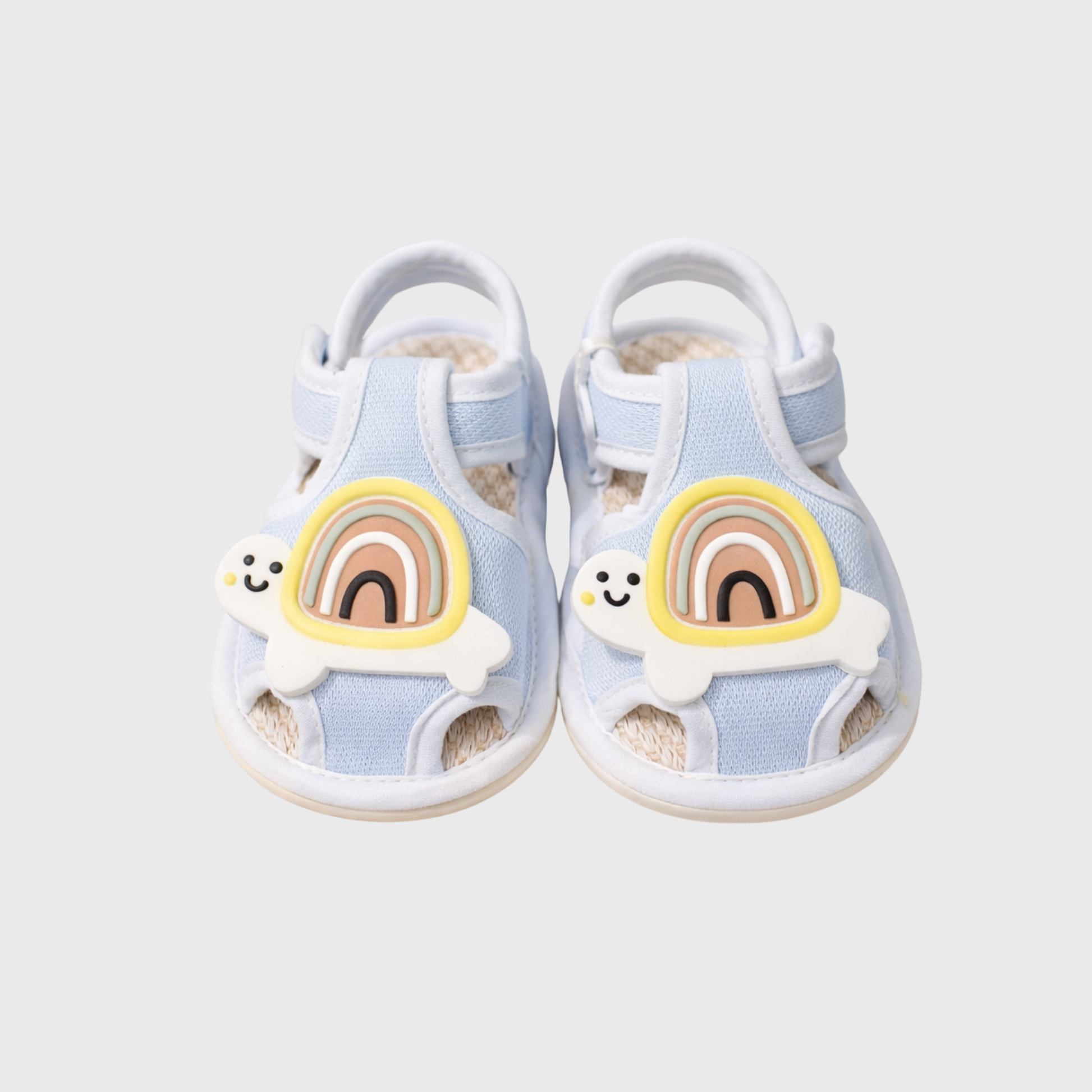 - Cheerful embroidered rainbow and cloud design with smiling face