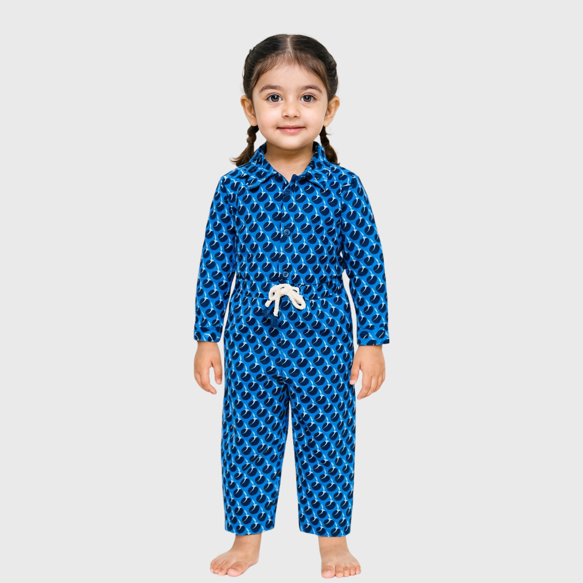 Make a playful style statement with this vintage-inspired utility jumpsuit, featuring bold geometric patterns and a smart button-down design — perfect for fashion-forward little ones.