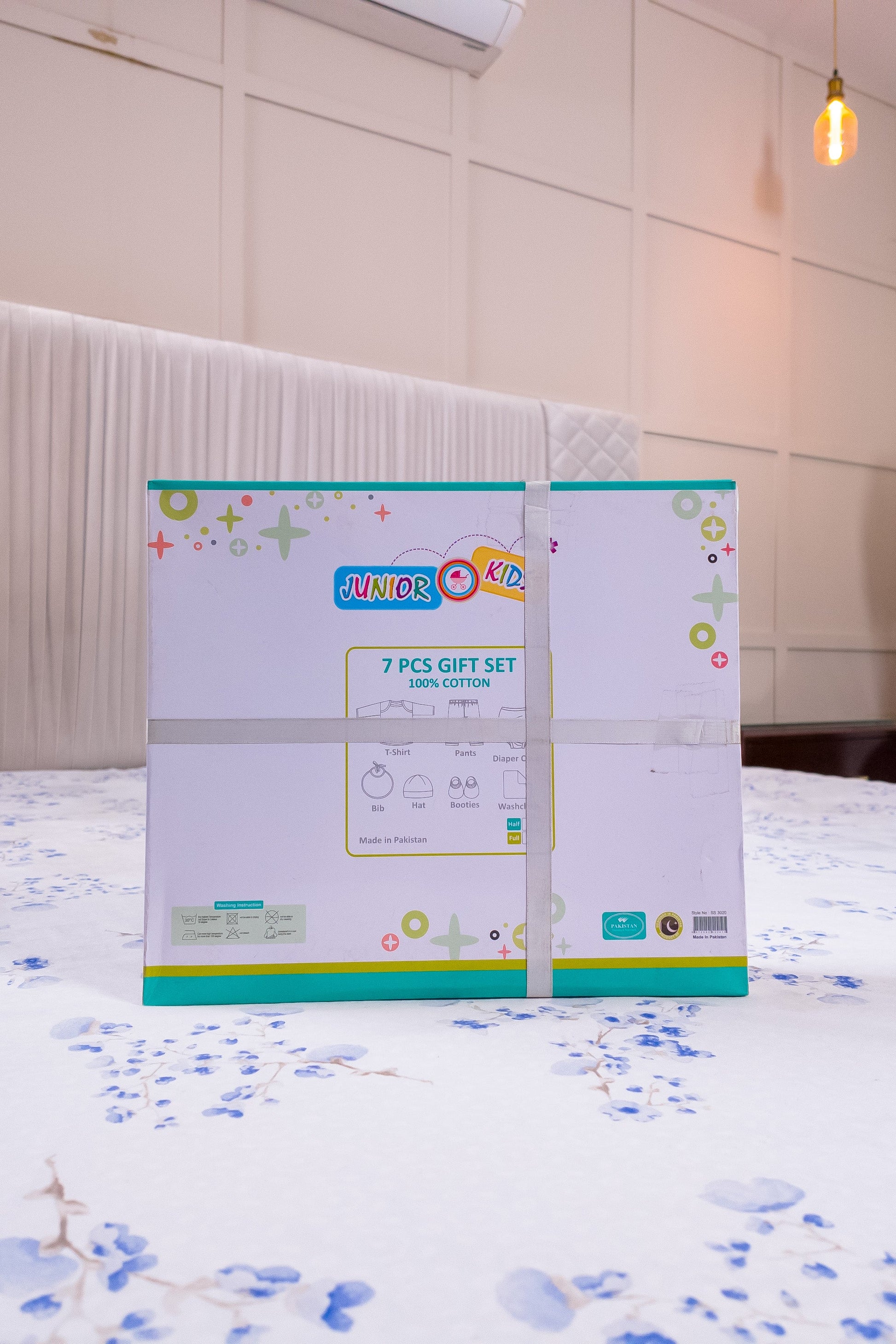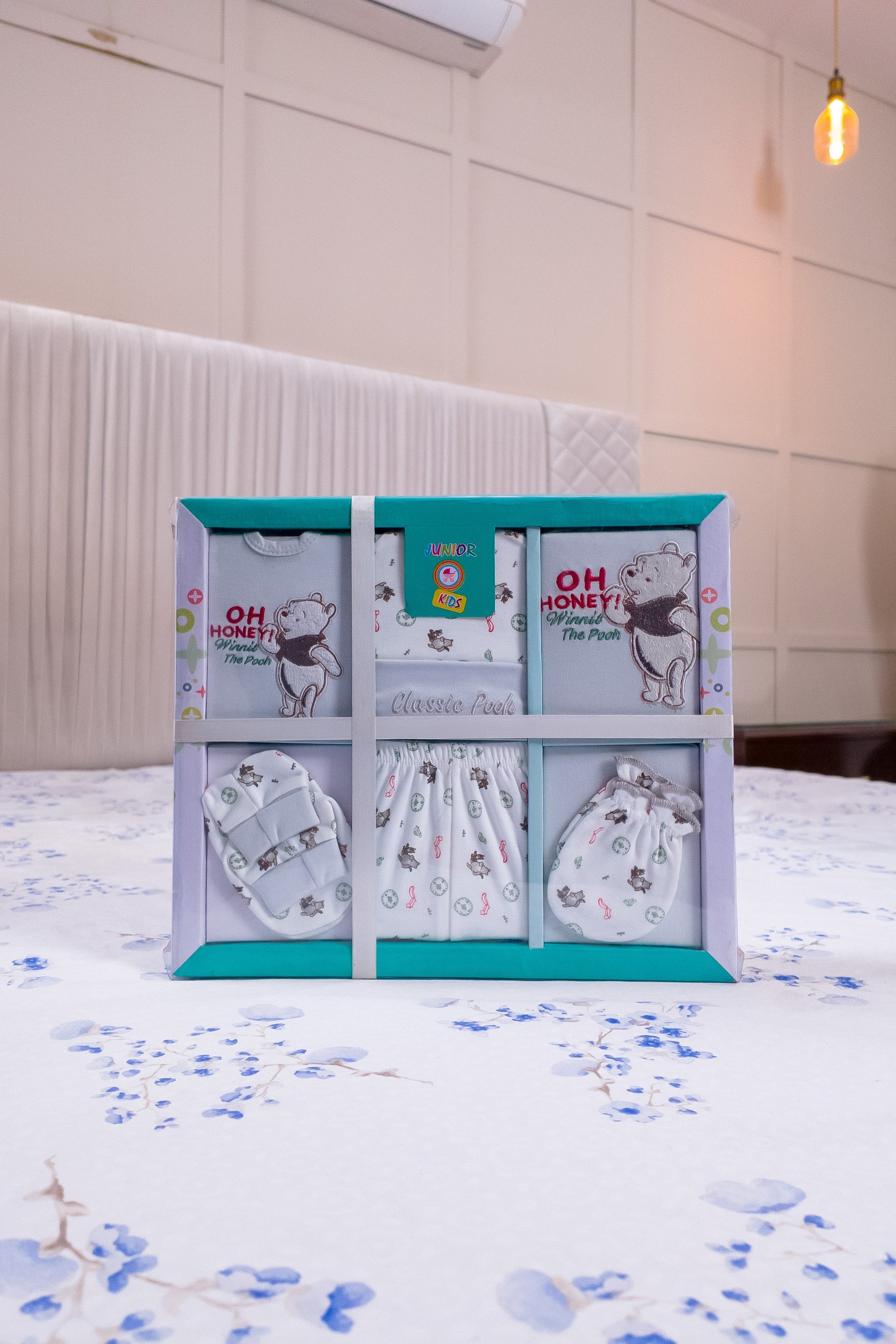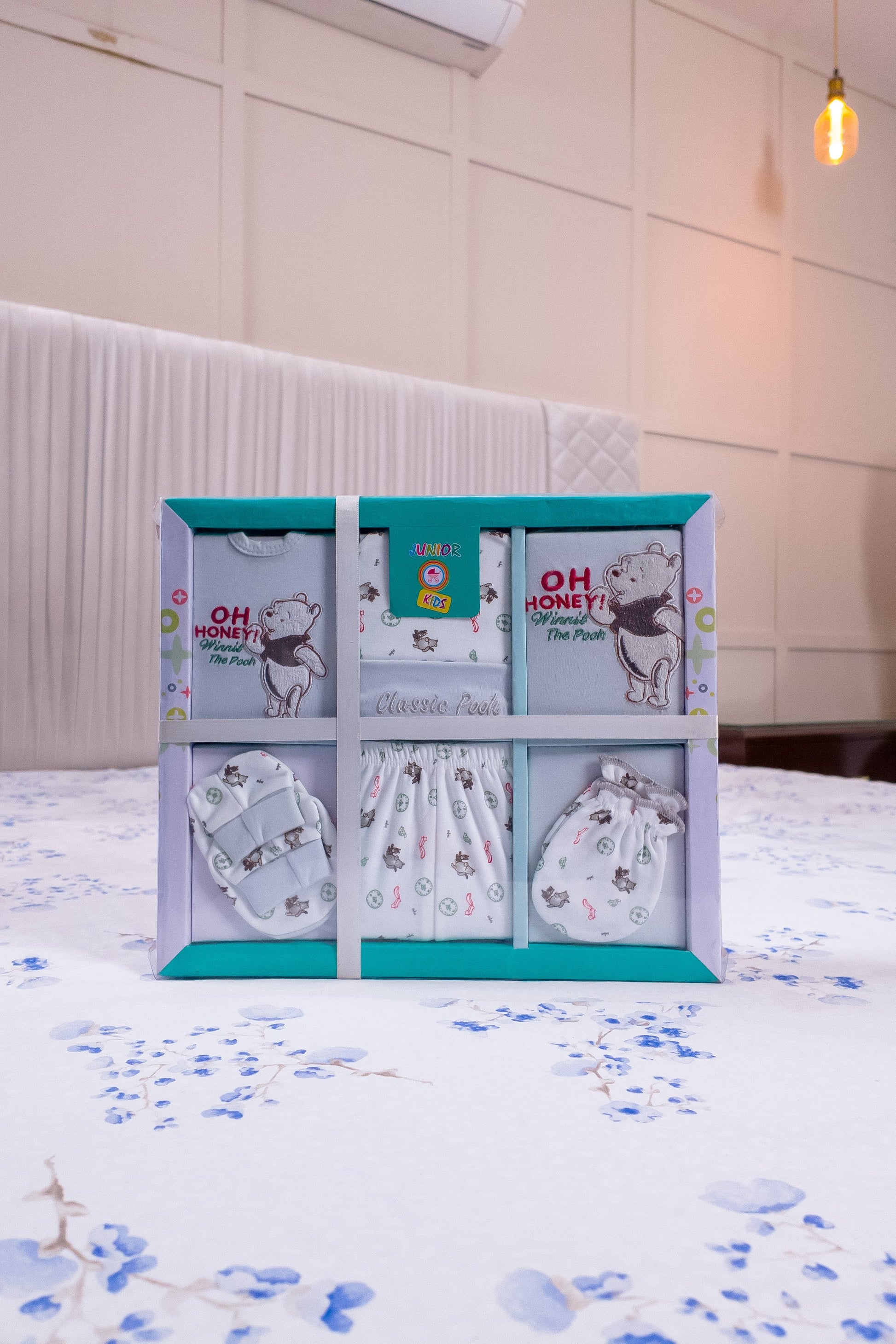 The set comes beautifully packaged in a turquoise and white gift box with charming Winnie the Pooh artwork. Each piece features delicate "Oh Honey!" graphics and classic Pooh bear illustrations in a gentle, baby-friendly color palette. Perfect as a baby shower gift or welcome-home present for newborns, this complete set provides essential clothing items made from soft, skin-friendly 100% cotton material.